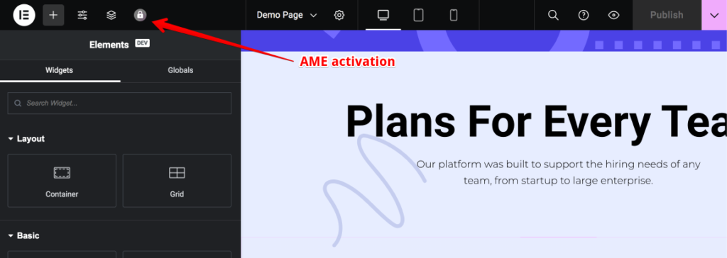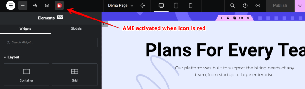In the Elementor editor top bar, locate the AME activation icon (lock button). When AME is not active for the page the button will be gray in color.